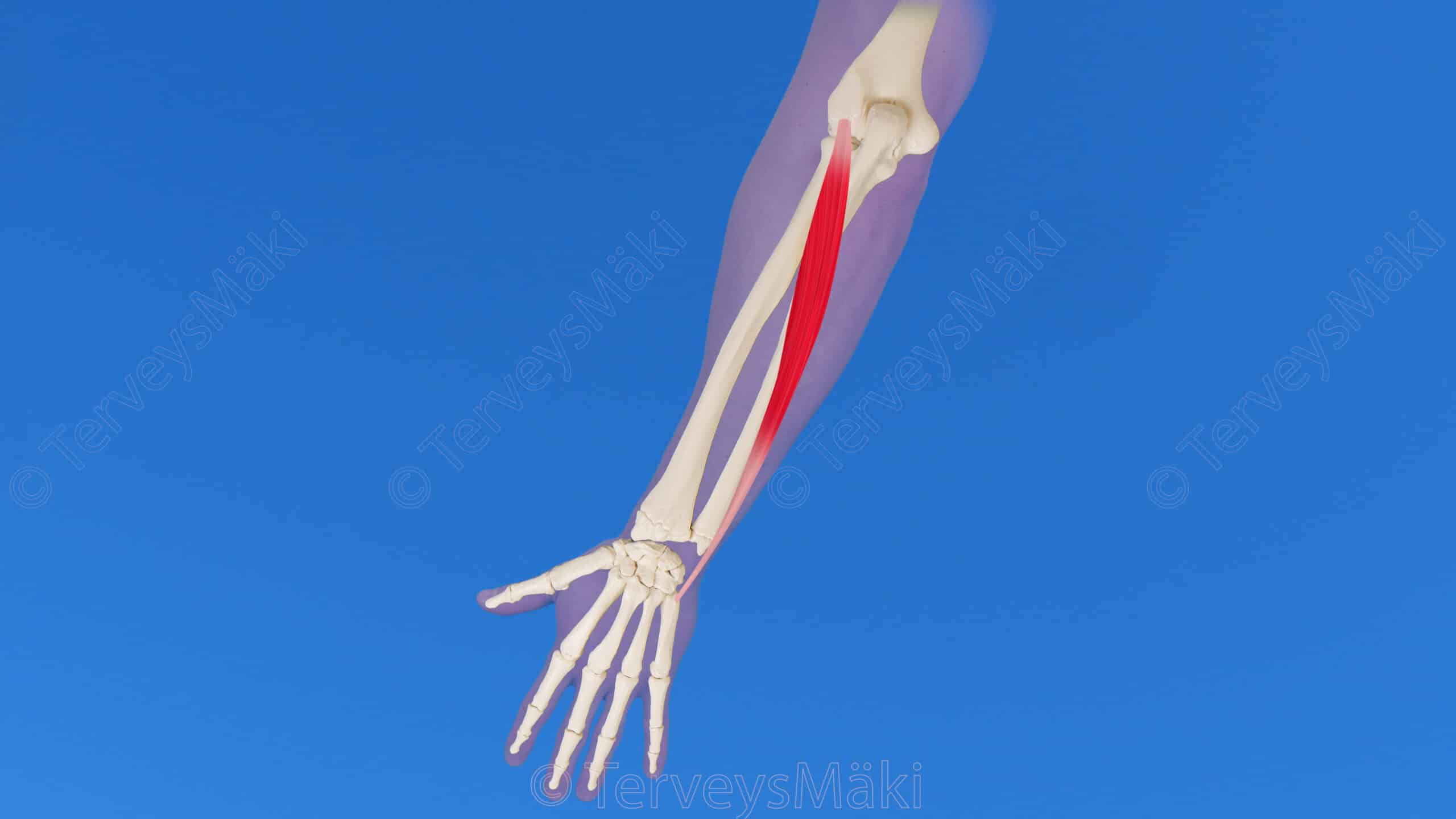 Kun suoritat lihaksen palpoinnin, asiakkaan kannattaa olla joko istuma-asennossa tai selinmakuuasennossa. Käännä asiakkaan kyynärvarsi pronaatioasentoon. Ensimmäisenä paikanna olkaluun ulompi sivunasta ja siirry sitten viidennen kämmenluun tyveen. Nämä kaksi kohtaa toimivat maamerkkeinä ja auttavat hahmottamaan lihaksen kulkureitin ja sijainnin.