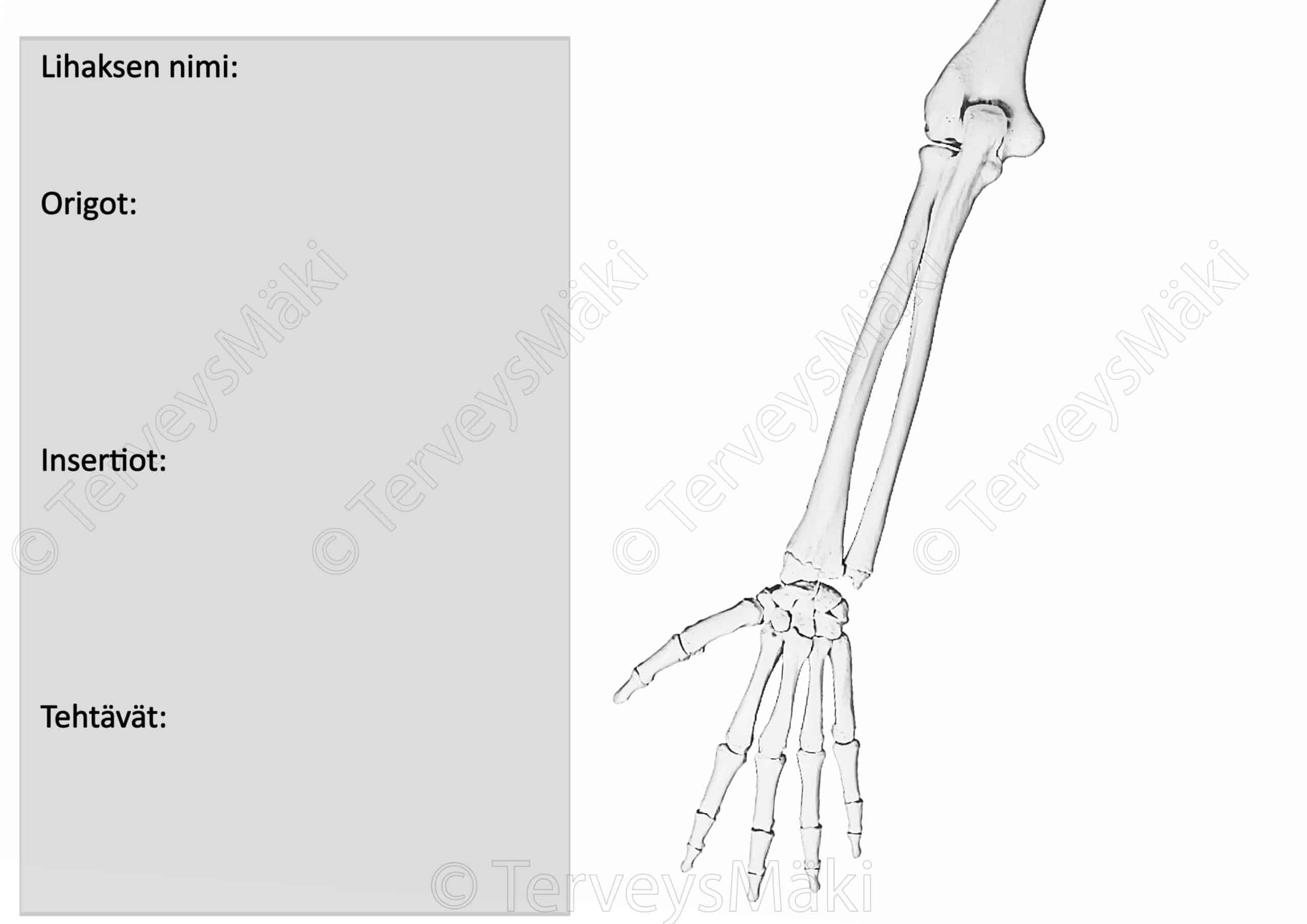 - Väritä kuvan luupohjaan lihaksen lähtö- ja kiinnityskohdat.