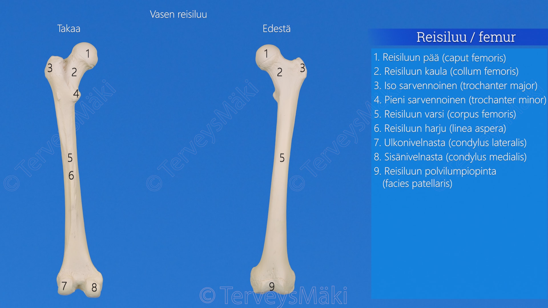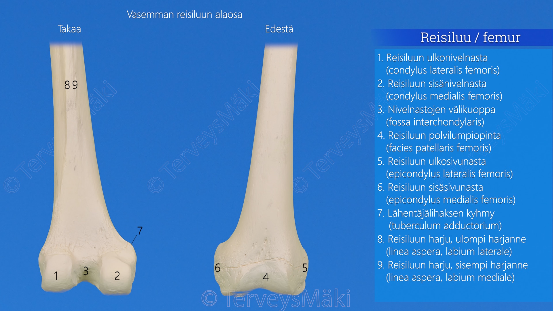 Reisiluun distaalipäässä sen runko alkaa levenemään, ja siitä voidaan palpoida reisiluun ulkosivunasta (epicondylus lateralis femoris) sekä sisäsivunasta (epicondylus medialis femoris). Sisemmän sivunastan yläpinnalla on lähentäjälihaksen kyhmy (tuberculum adductorium), joka toimii reiden ison lähentäjälihaksen yhtenä kiinnityskohtana.