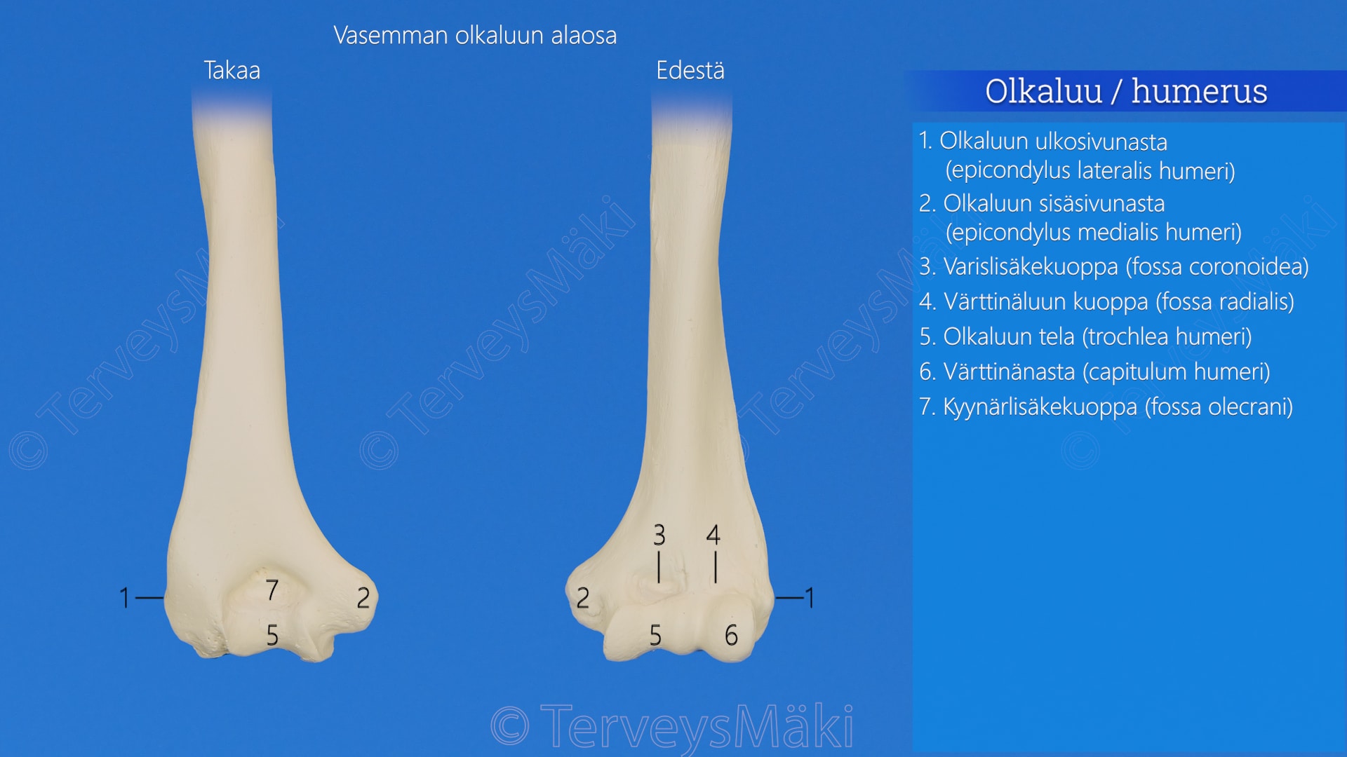 Olkaluun distaalipään etupuolella on kaksi anatomisesti merkittävää kuoppaa, jotka ovat olennaisia kyynärnivelen toiminnalle. Ensimmäinen, joka sijaitsee hieman mediaalisesti, on varislisäkekuoppa (fossa coronoidea). Tähän hieman isompaan kuoppaan siirtyy kyynärluussa oleva varislisäke, kun kyynärniveltä koukistetaan.