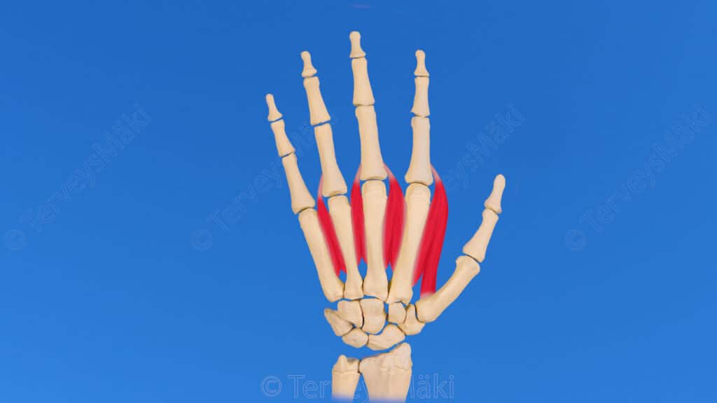Lihasten sijainnin määrittäminen on suhteellisen yksinkertaista, sillä niiden lähtökohtina toimivat kämmenluut ovat helposti palpoitavissa. Aloita paikantamalla ensimmäinen lihas, joka on helpoiten tunnusteltavissa. Hahmota aluksi kädenselän puolelta ensimmäinen ja toinen kämmenluu sekä niiden väliin jäävä tila. Paikanna sitten etusormen tyviluun peukalonpuoleinen reuna, johon lihas kiinnittyy. Näin saat hyvän käsityksen ensimmäisen lihaksen sijainnista.