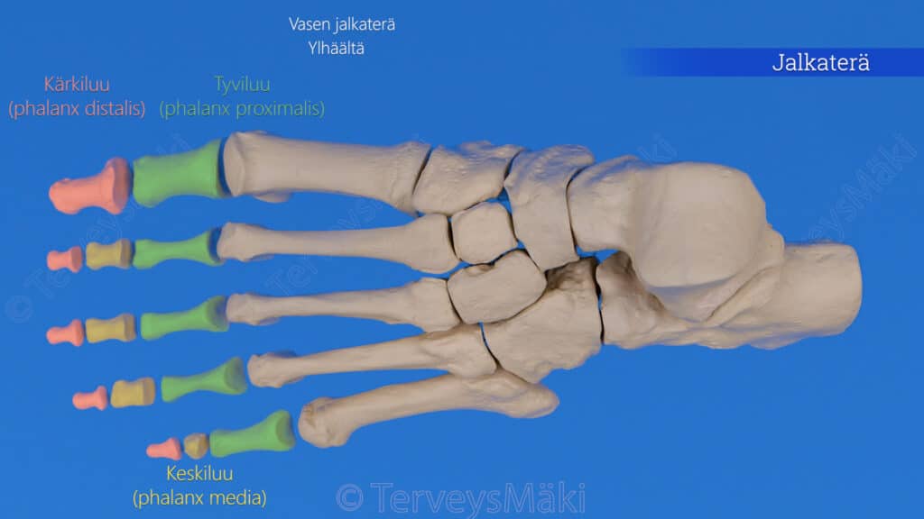 Jalkaterä voidaan jakaa kolmeen pääalueeseen: nilkkaan (tarsus), jalkapöytään (metatarsus) ja varpaisiin (digiti, digitus pedis). Näiden alueiden luiset rakenteet koostuvat yli 26 erikokoisesta luusta. Lisäksi jalkaterässä on pieniä seesamluita, jotka lisäävät jalkaterän luiden kokonaismäärää. Jalkaterän anatomia on kohtuullisen monimutkainen, mutta sen ymmärtäminen on avain moniin kliinisiin kysymyksiin ja alaraajan biomekaniikan ymmärtämiseen.