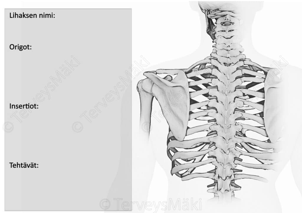 • Lihaksen lähtö- ja kiinnityskohdat suomeksi ja latinaksi.
