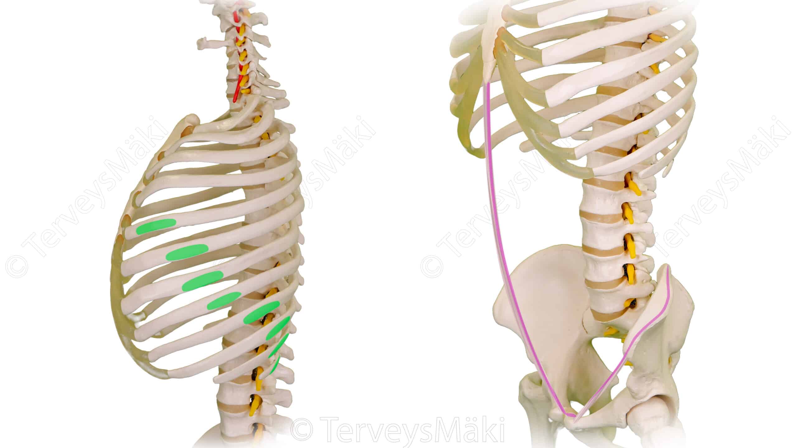 -Toispuoleisen lihassupistuksen aikana: vartalon lateraaliflexio (sivutaivutus) ja vartalon rotaatio (kierto) vastakkaiselle puolelle