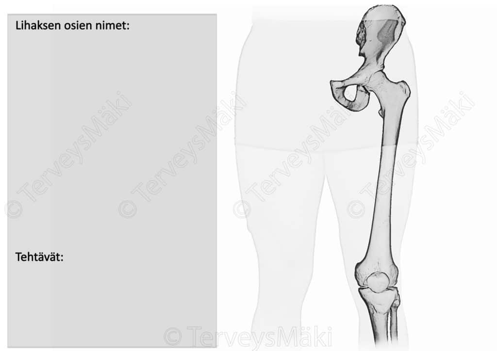 - Lihaksen lähtö- ja kiinnityskohdat suomeksi ja latinaksi.