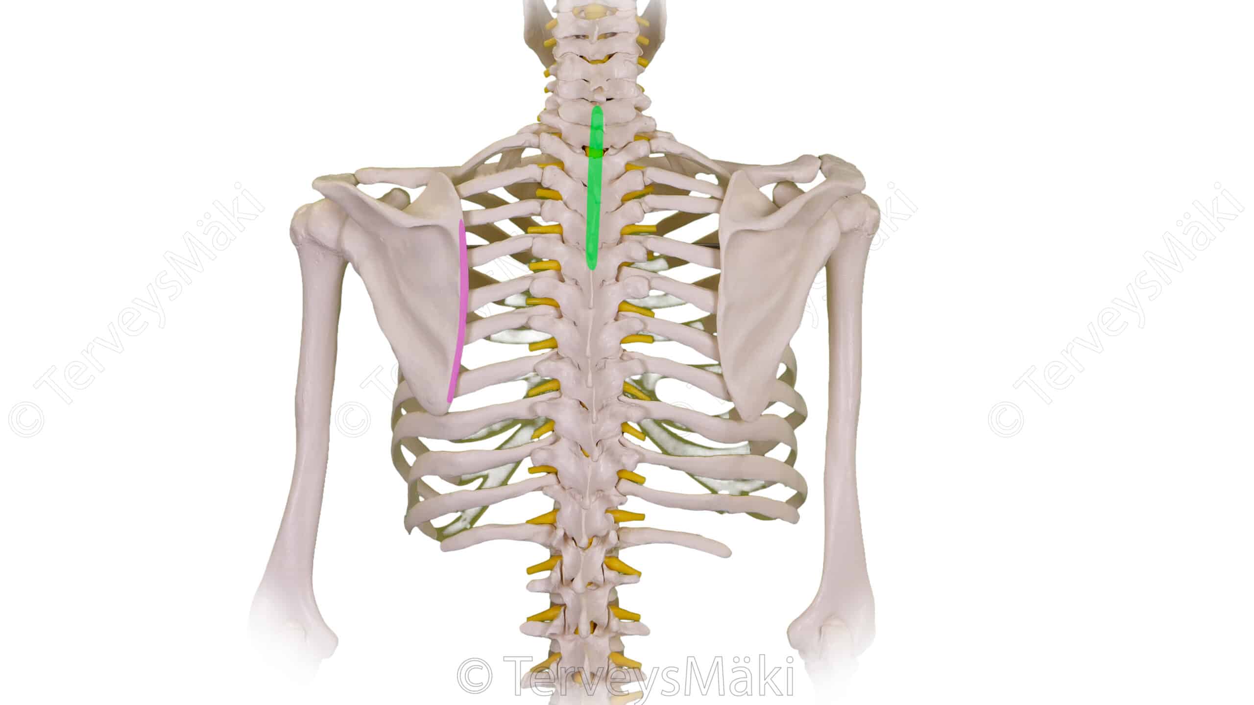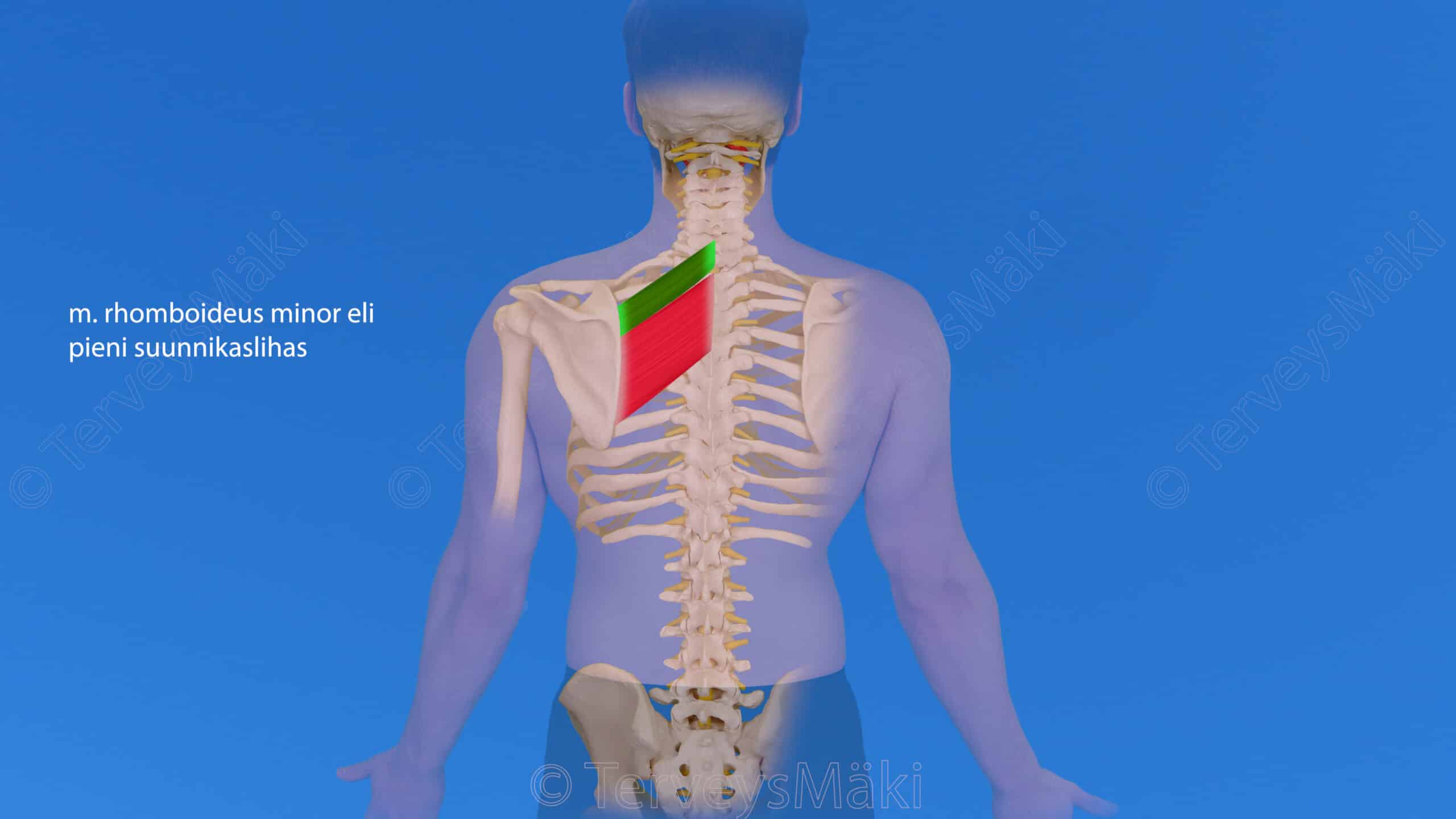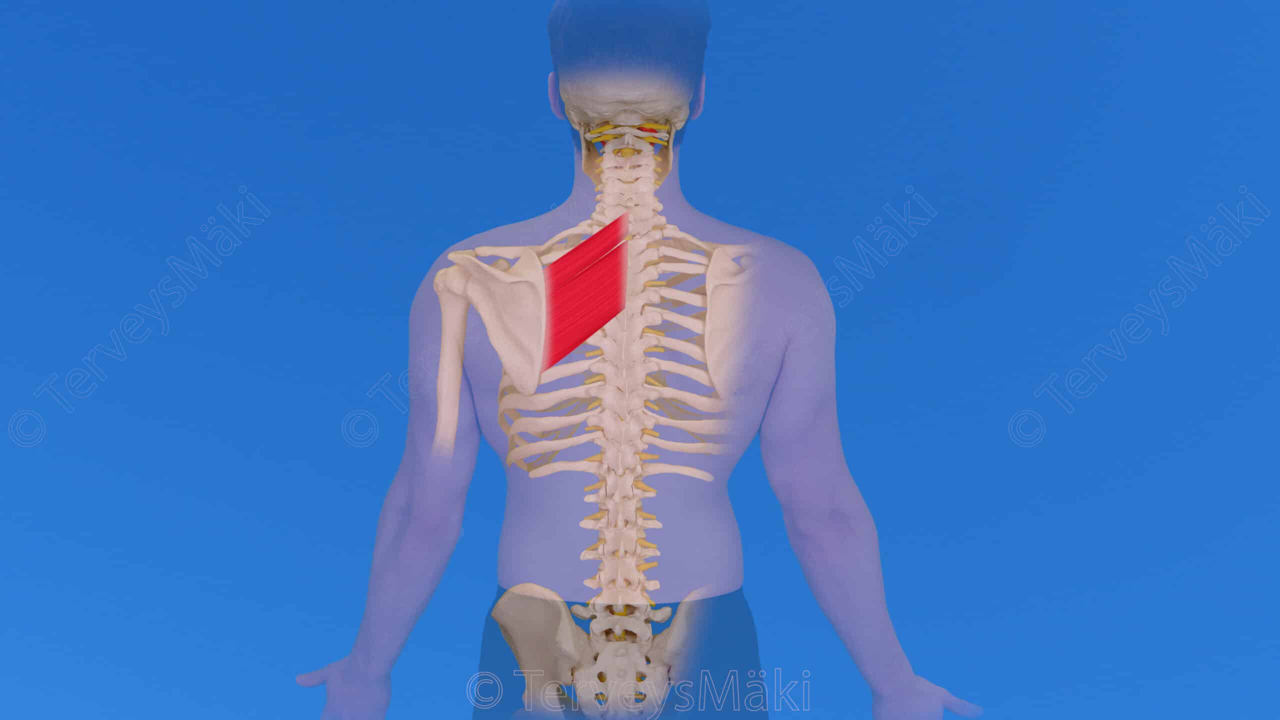 Kuva rhomboideus lihasten lähtökohdat & kiinnityskohdat