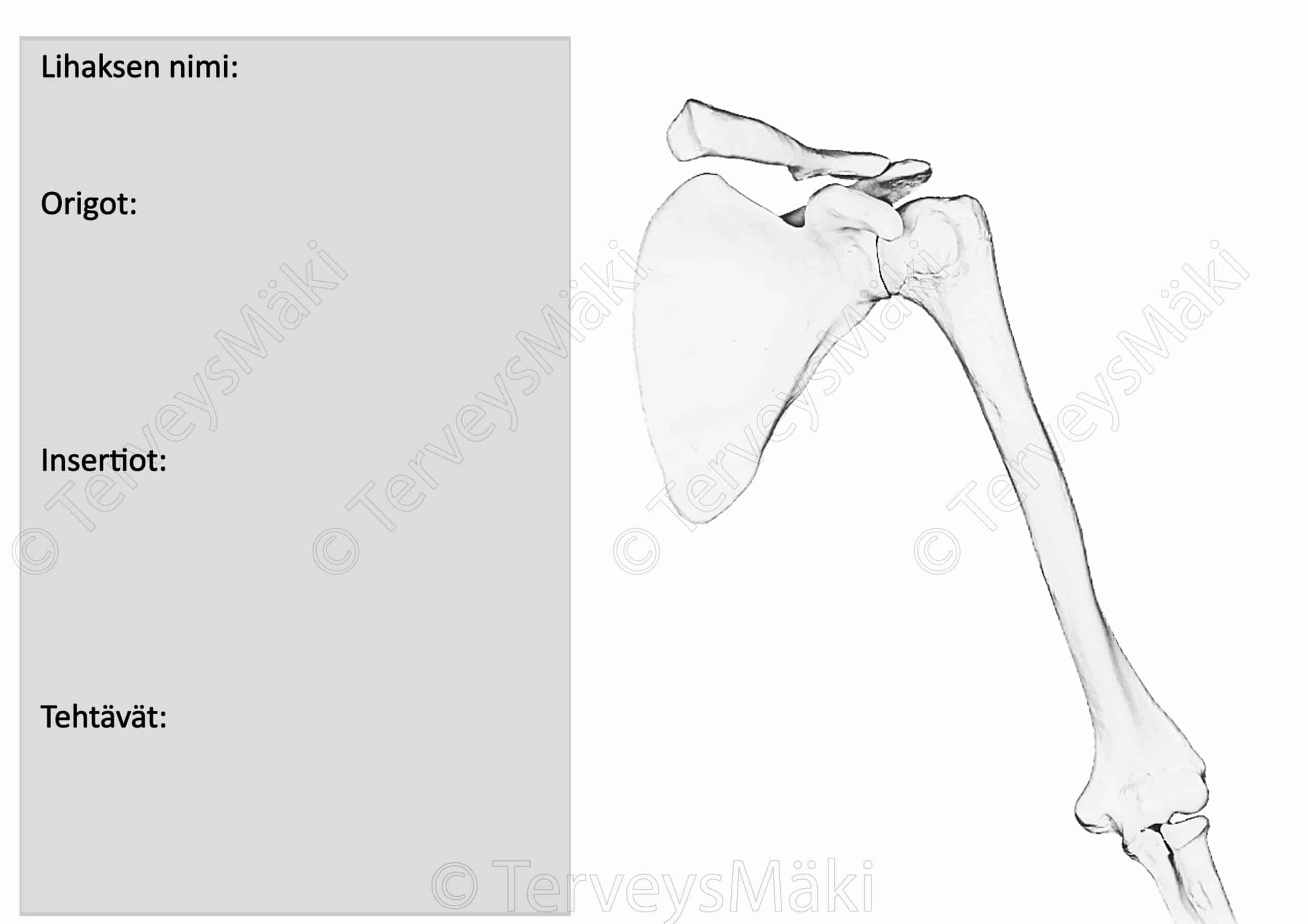 • Lihaksen lähtö- ja kiinnityskohdat suomeksi ja latinaksi.