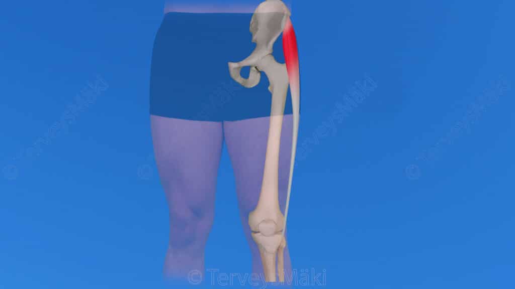 Kuva tensor fasciae latae lihaksen lähtökohdat & kiinnityskohdat