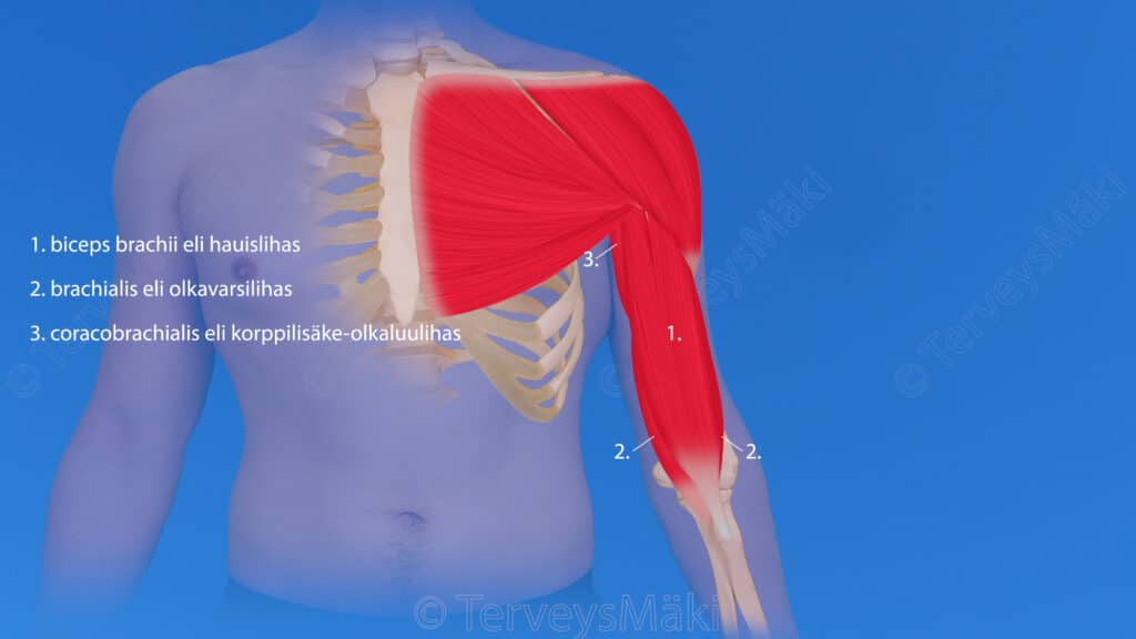 Olkavarren etupuolen lihaksia hermottaa lihas-ihohermo (n. musculocutaneus).
